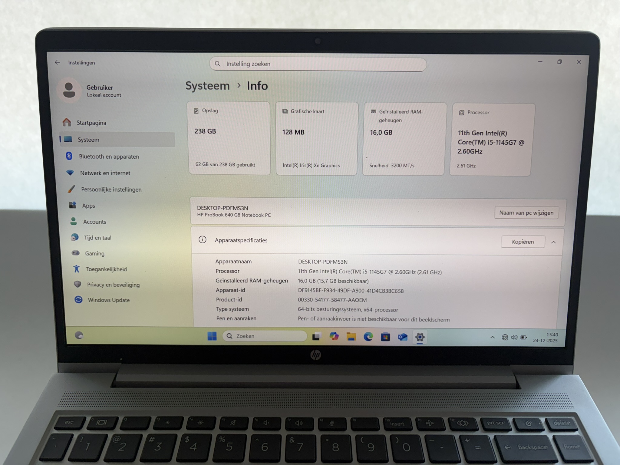 De laptop wordt geleverd met Windows 11 Pro en de originele HP-oplader.